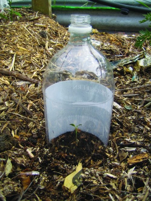 To protect young seedlings from birds, slugs and hard frosts place a clear, two-litre plastic drink bottle with the bottom cut out, over each seedling. Remove when it constricts the plant.