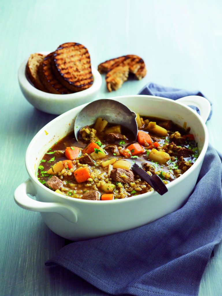2 While stew is cooking, heat a frying pan over a high heat. Add pearl barley and dry-fry for 3-4 minutes, stirring constantly. When grains give off a smoky aroma, remove from heat and place in a saucepan of cold water. Bring to the boil and simmer for 5 minutes. Drain well.