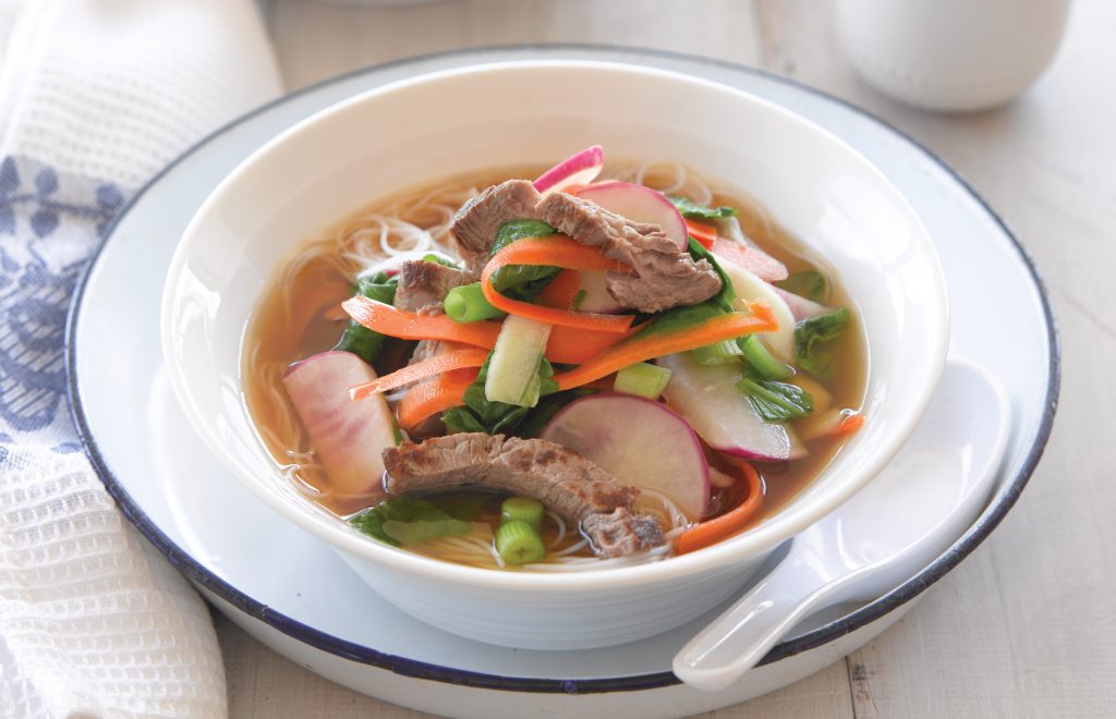 2 Meanwhile, shred or thinly slice beef. Add to pan with miso, soy sauce and mirin. Scatter over radish and serve garnished with fresh coriander if preferred.