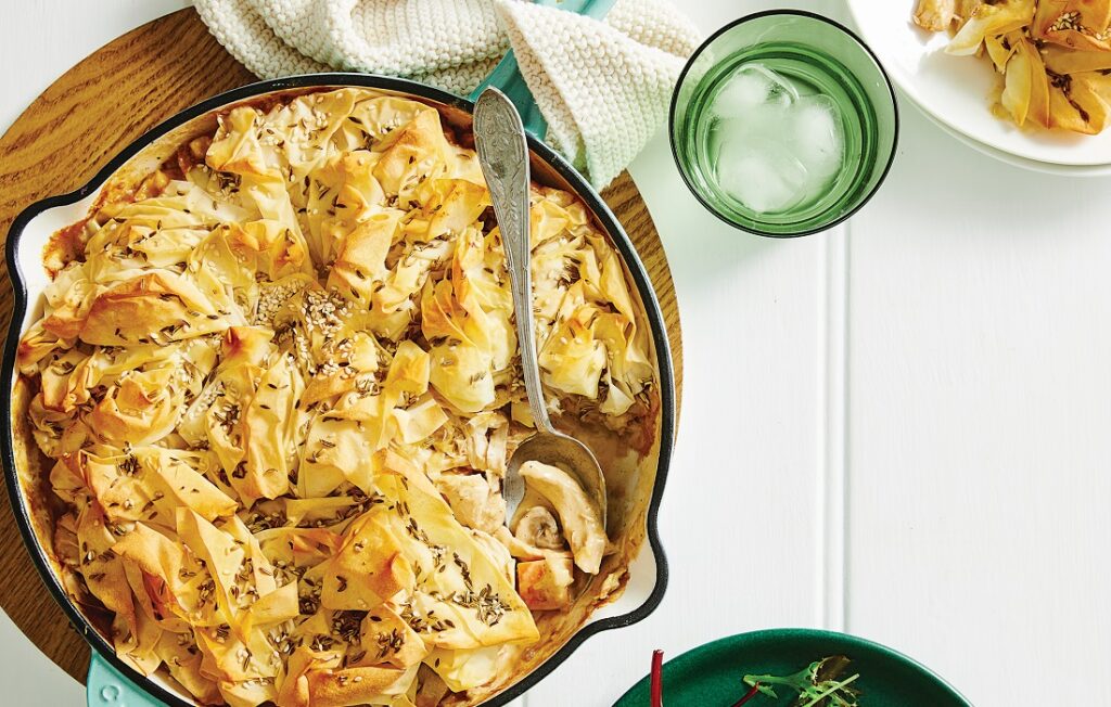 3 Lightly spray filo sheets with olive oil. Scrunch into rough balls, then place over chicken mix in pan to cover. Spray top with oil and sprinkle with seeds.