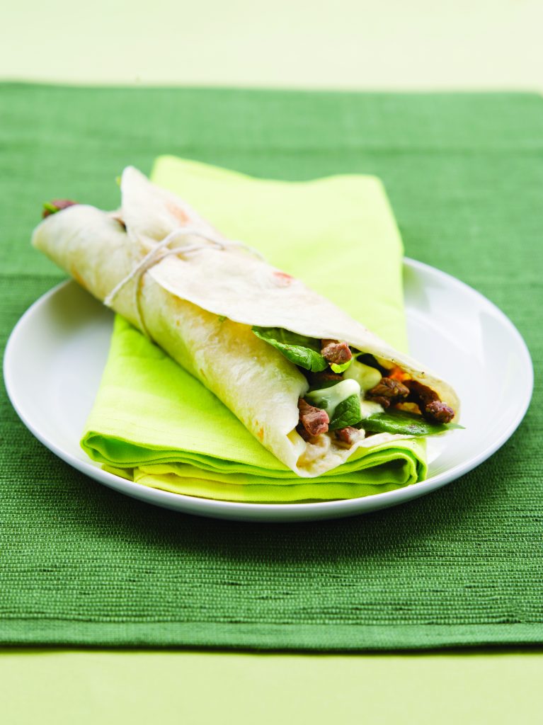 3 Place tortillas on plates and cover with hummus. Place meat all over, then spinach or lettuce, herbs and cheese (if using). Squirt mayonnaise on top.