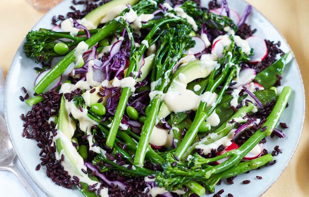 This delicious vegan salad dish offers the healthy crunch of broccolini and mixed greens, drizzled with a creamy miso dressing.