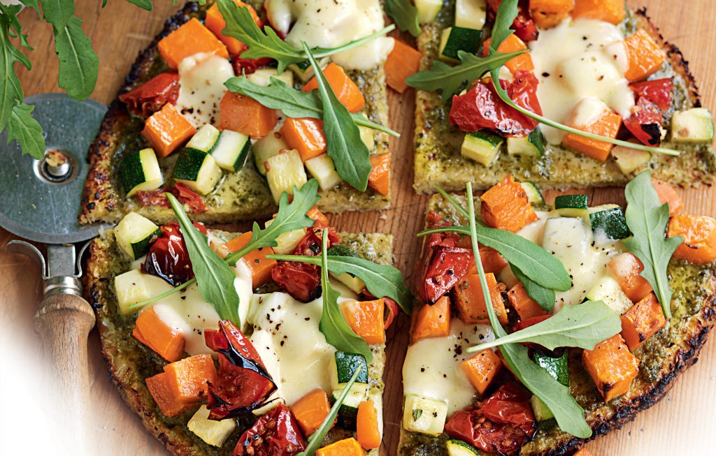 2 Spread cauliflower crusts with an even layer of basil pesto. Top crusts with roasted vegetables, semi-dried tomatoes and bocconcini.