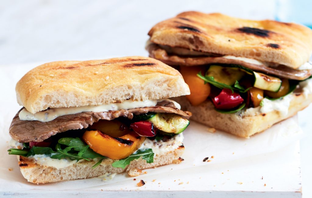 5 To assemble, spread a little mustard yoghurt on bread base. Top with salad leaves, charred vegetables, beef and remaining mustard yoghurt. Sandwich with bread top. Cut into four portions and serve.