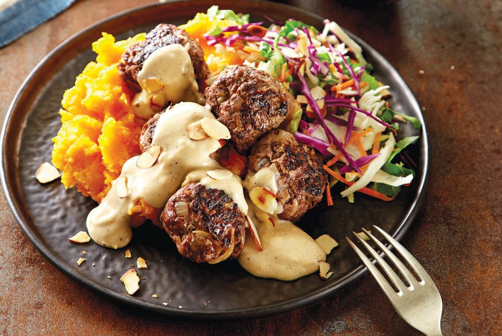 - Spoon gravy over meatballs and serve with mash and coleslaw. Garnish with almonds and parsley.