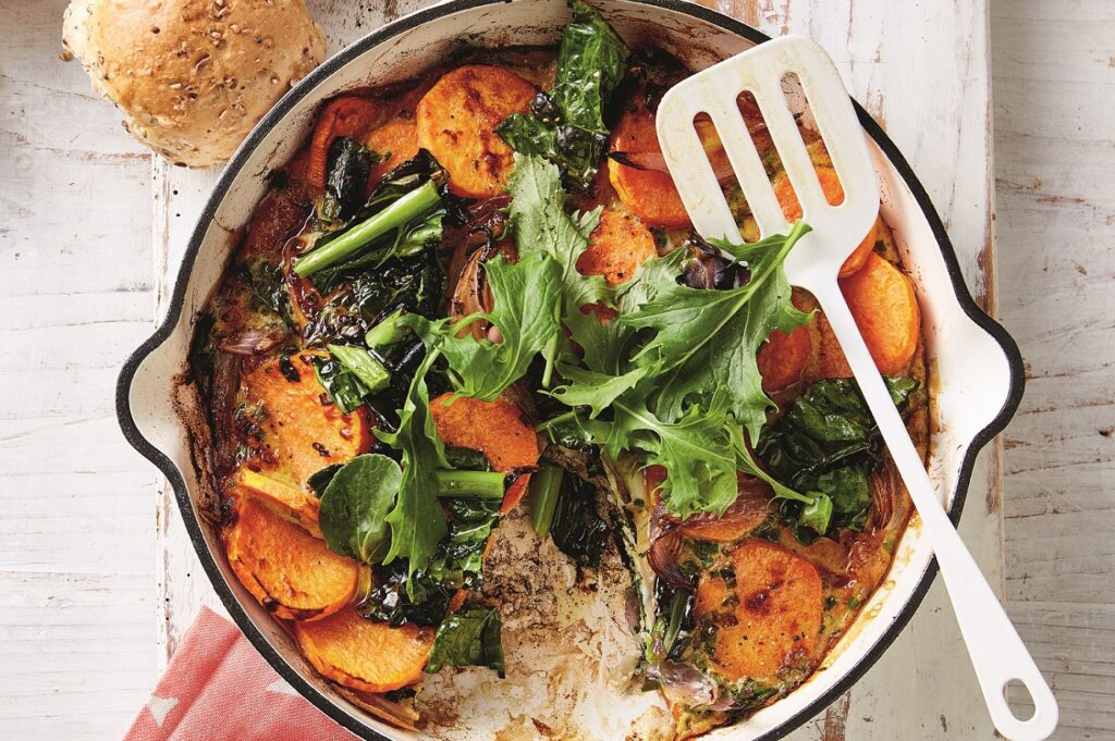 3 Heat oil in a 26cm non-stick frying pan over medium-high heat. Add onion and kale and sauté for 2 minutes or until slightly softened. Add sweet potato, then cook for 4 minutes, stirring gently. Add eggs and gently tilt pan to allow egg mixture to spread evenly. Cook for 3-4 minutes, without stirring, or until egg is almost set. Remove pan from heat.