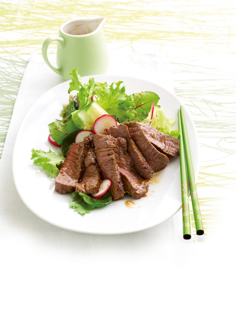 1 Spray a large frying pan with oil and cook beef over a high heat for 4-5 minutes each side or until cooked as preferred. Add teriyaki sauce. Turn beef to coat. Remove from heat and stand for 5 minutes. Slice thinly then set aside.