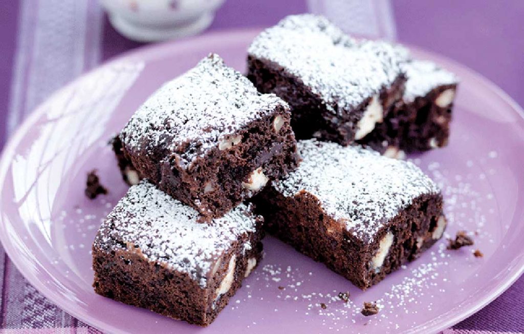 4 Cool in the tin for 5–10 min before turning out on to a wire rack. When completely cool, slice into squares and dust with icing sugar to serve.