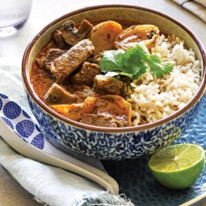 3 Add the broccoli and peas to the curry and cook for 10 min more. Remove from the heat, stir through the almonds, then serve with the brown rice.