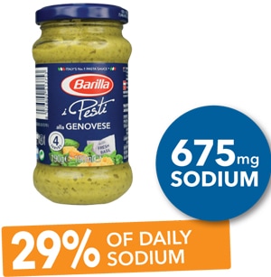- We tend to use less pesto than other types of pasta sauces, so we have compared the sodium content of pesto sauces per 50g.